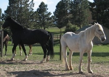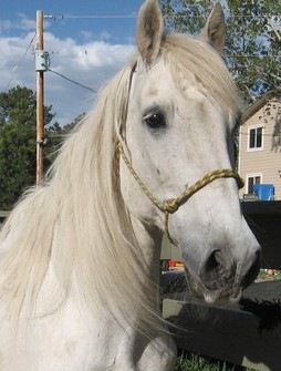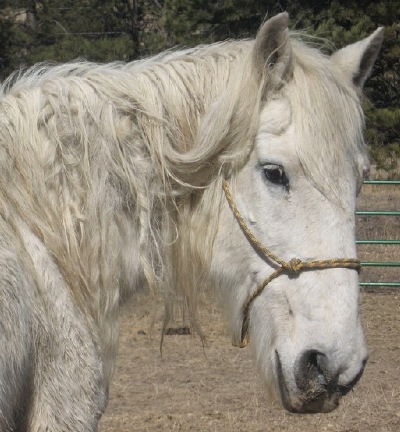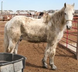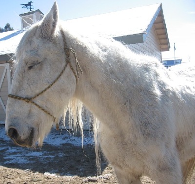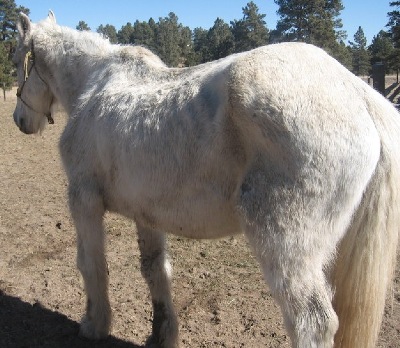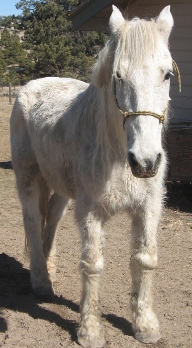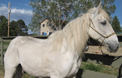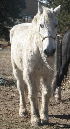 Note from foster-mom 3/26/2008: Gandalf is Gandalf *laughs* A nicer, less intimidating horse you could not ever hope for. ......... He's been eating really well, and I hope he starts to fill out soon. He really is very thin still. He digests his food well, though. No trouble chewing and his poos are well masticated. Every once in a while, he'll actually trot a bit while playing with Grampy, so his legs can't be at their worst. He must have suffered some abrasions or what not on the feed lot, since he's now had some scabs come off of his rear, side, and his left ear, leaving some ugly patches, you know how lovely those look on white horses. Anyway, you can see how thin he is, and that his front legs are knobby. Since he's been here, he's been blowing his winter coat, and the real extent of his thinness has become clearer since he's not as fuzzy.