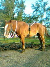 Note from the trainer 06/2008: Nice Gelding. Would make a good riding or driving prospect. Easy to bridle. Stands for saddle pad. Doesn't neck rein, but responds great to plow reining. Flashy look. This guy loves attention. Stands good for ferrier. Stands tied. Trailers good.