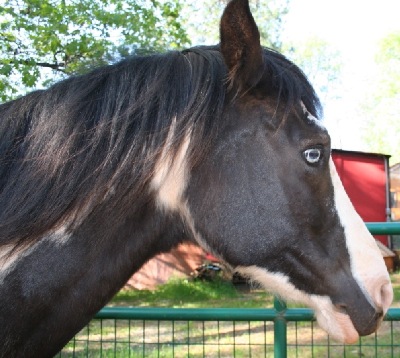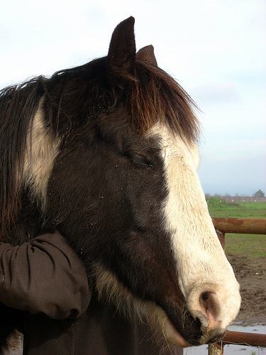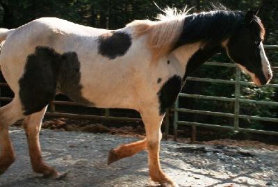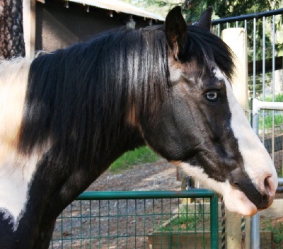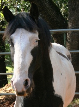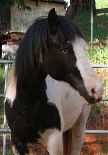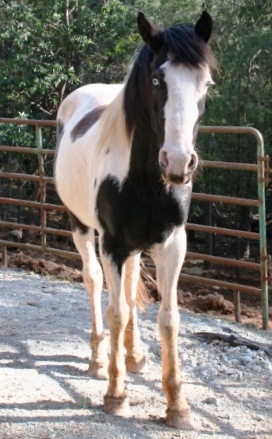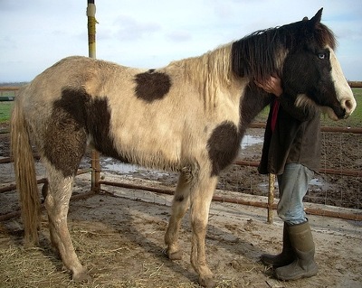 27-Jan: ...this evening I put his hay in his paddock, and then just stood there. He watched me for a moment and then walked right up to me! He wand to sniff me all over, introduce himself and see who I am. He was calm and nice about it, not pushy or frightened at all. He was very interested in my hands, but I'd just fed all the other horses, which includes some tasty stuff! He nudged my hand gently, I stroked his chin, and bottom of his jaw a little. He liked it and moved his head so I could rub a bit on his cheek. All the while very respectful of my space and not pushy at all. I am very pleased. He seems to be very gentle overall, kind and in need of affection. Even last night in the dark he was listening to me really well. Anyway he seems to be a really nice boy. His feet look very good, he has a sparkle in his eyes, which are the nicest blue. He is a bit thin, but not too overly thin, though he is pretty hairy. He just has a very kind, soft eye. But I think he will place easily enough, as far as ground manners go.
