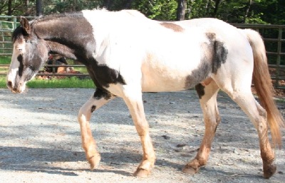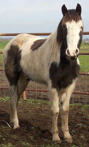 31-Jan: I managed to work with Skyler for quite a bit yesterday. He is a very sweet boy, mellow, kinda shy. Definitely has some decent training though. ...I would say he has ground manners just that he tries to see what he can do with a new person. He responded instantly to everything I asked, or blocked. He does tend to want to crowd you when you walk, but he stops when you stop, goes when you go, turns when you turn. If he is here long enough I can polish that up so he will know to keep a more respectful distance at all times and pay attention a bit better. I would say he has been worked ala 'Parelli' or some form of "natural" training... He has pretty nice movement overall, I only walked and trotted him a bit in straight lines and large circles to get an idea. No canter, lope. I may turn him loose this afternoon and see if I can coax him to a canter and get an idea... His walk stride is really nice, and he has a smooth trot, he really uses his hind leg joints. (I ride dressage so this is something I always look for, do they know how to use their joints and bend....) He is not real even in his strides, but that could be due to lack of work too, hard to say. He does need muscle and of course strength. I would say if he has been under saddle, he'd be a nice riding horse just based on what I saw yesterday. He did everything I asked easily and without any fuss at all. He will quietly pick up a foot when asked, he will allow touching all over his body, ears, sheath, everything. 1-Feb:Yes I do believe he is art draft of some sort. He is definitely 'paint', a dark sable brown and white. Not sure if he would be called a "medicine hat paint" because the 'hat' extends down one side of his face, but it is separated for the other side under his chin. He has the blue eyes, and the "hat" for sure. Anyway I think he may be a stall as 16.1, he is definitely 16 hands. Course I would have to really measure him, I am guessing based on my height and experience (and other horses). He is built nicely, I think. He reminds me very much of my little Friesian mare in his build overall. His croup is slanted quite a bit, a daft trait for pull power, but enables him to step underneath easier too. He has feathers, but yeah it's winter, but his chin and face shape looks 'draft' to me, Percheron possibly. I can say I have never seen a pure QH paint with conformation like this boy. There is draft in there somewhere. And his overall demeanor is more like a draft, mellow, laid back, easy going, gentle..... He's very cute!! He adores my husband, and my husband thinks he is the cutest thing...