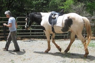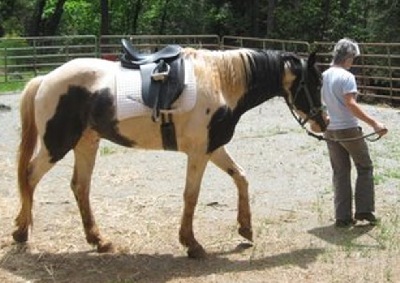 9-Feb: I got Sky saddled. He is no problem!! He has been ridden I am sure cause the saddle was a non-issue for him. ...I walked up to him with the pad, let him look at it and sniff, then I tossed it up on him. He just stood and sighed. I then approached him with the saddle again letting him see it and sniff it, then I placed it on him. Again he just stood, relaxed. I ran my arm under his belly where the cinch would go, no reaction. (good!) I then grabbed the cinch and brought it up against his belly, once more no reaction, so I went ahead and threaded the billet and got ready to begin snugging it.... As I began to tighten the cinch he stepped sideways a couple steps, I stopped of course, loosened it a bit; we stood and waited unto he was relaxed again. Then I snugged it a bit more. Each time he just quietly stepped sideways and we allowed him to do this, and each time I stopped snugging, allowed the girth to loosen a smidge and then we would just stroke his neck and wait fro him to be fully relaxed again. This only happened like three times. When I did the final 'snug' making the girth tight enough to mount up he didn't move! At this point I had my helper just walk him around a bit. He was fine! She slapped the stirrups against his sides, he smacked the saddle seat with her hands, he just stood (looking at her like she was nuts!). I took him and asked him to walk on around me, then asked him to trot. again, no issue!! He trotted on nicely, changed direction, trotted the other way nicely and quietly. He does real well on voice commands, especially on a line. That was where I left it, I unsaddled him and put him back. I do want to try a bit, or two. I'll do both snaffle and a curb and see how he does with them in hand. Then if I can get my buddy to get on him, we'll try a bit of riding just to be sure he is ok with a rider.