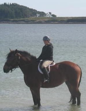 As you can see, I ride her bareback with a rope halter. She's never been bitted and never will be. I have an extra-wide AP English saddle that I bought specifically for her - a gorgeous saddle that's really comfortable - but she outgrew it in her 3rd year. I used it for training purposes only, to get her used to having a saddle on her back. You could put a train engine up there, and she wouldn't care. I weigh 155 lbs and she doesn't register it at all when I jump on. Her back is really broad and she has no wither to speak of. Super strong, thick horse.