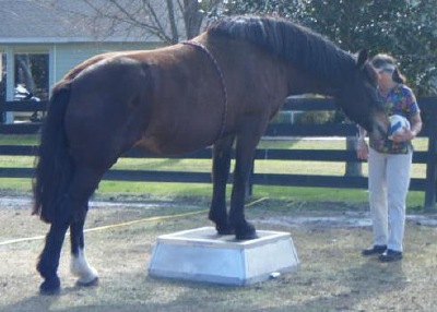 Hi, ......The second photo shows Kavi on a Parelli platform - at liberty... (I wrapped her reins around her belly because I didn't want to lose them.) She tried really hard to get all four feet up there, but she's just too long to fit. We eventually put two of the platforms together and she put front feet on one and back feet on the other. She's totally fearless about equipment, vehicles, new situations, deer, dogs, water, mud, etc. She'll even climb big rocks or saunter down ribbed concrete boat ramps to get in the river. She rarely freaks, and when she does she simply spooks in place with no lateral or forward movement. For such a young, green horse, she's exceptionally reliable.