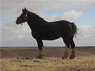 When we got him he would just as soon try to climb the fence as look at me. Now I can catch him about anywhere, if I take my time and let him think a moment he will come to me and say its ok, catch me now. He puts his head down to make it easy. He is snatchy with treats so I do not feed him many by hand. It is like he thinks we will jerk them away if he doesn't grab them fast. You can pet, brush, and curry every inch of his body. I have braided his mane and tail. We have sat under him scratching his legs and picking ticks off of him. He will pick his feet up and generally stand good while they are trimmed. Which they need again. He loads in the trailer better then most horses. He stands stock still for the harness to be pushed/pulled/dragged on to his huge frame. He lowers his head and takes the bit. He stands like a statue while we hook him up and adjust and pull what ever up to him and rattle chains talk, laugh, get on and off the cart or what ever, spit, cough, sneeze, trip and stomp around in our heavy mud boots. Then it all goes to heck when we start moving. First we had him hooked with our old percheron mare and he went back and forth and sideways but we got around the field. Unfortunately she died last summer. We have hooked him by himself to a forecart with a bridge plank behind it. It is one we can both ride on. We finally put a running w on him so I did not have to drag on his mouth so much. He respects that and we have never had to take his feet away. BUT he just gets in better shape and does not start thinking. We will be going along and one of us will say something and he is off. Or we will be talking and one of us will laugh and he is off. It was bad when I had a cough and we would be off and I would keep coughing! We tried him without blinders but it was MUCH worse. He has a phobia about things behind him. So I am failing with him and I feel bad about it. I needed more work for him to do. If you know of someone that could put him in a hitch and work him for a summer he might get over it. I have stood on the water tank and leaned on his back, he doesn't worry about that. He leads like a balloon and ties well. He will pull back if life in front of him gets real scary like me playing with a mule that starts jumping around. We have lead him with the pu and lots by foot. He is willing to follow.
